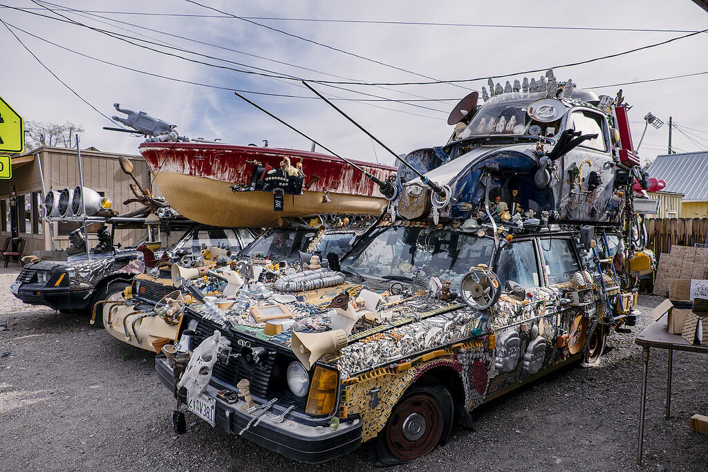 Рядом с магазином я обнаружил нечто удивительное — причудливые арт-инсталляции. Один автомобиль венчал другой, на соседнем красовалась лодка, а вся композиция была обильно украшена шестеренками, игрушками, обломками пластика и трубками. Это был яркий всплеск креатива на фоне всеобщего упадка.