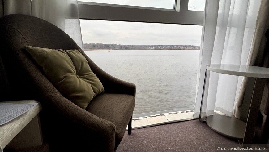 Наша каюта площадью 19 квадратных метров напоминала стандартный отельный номер, но с одним исключением — панорамным окном, за которым плескалась вода. Особый кайф — лежать в кровати и смотреть на бегущую прямо под тобой воду.