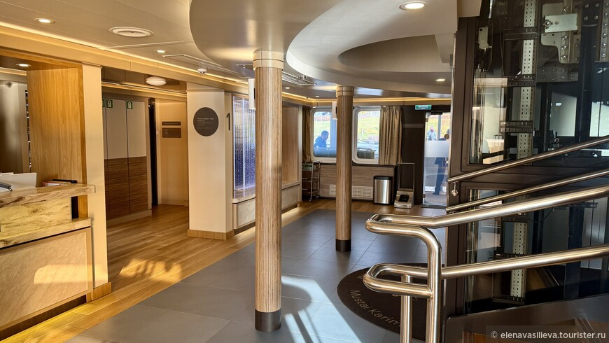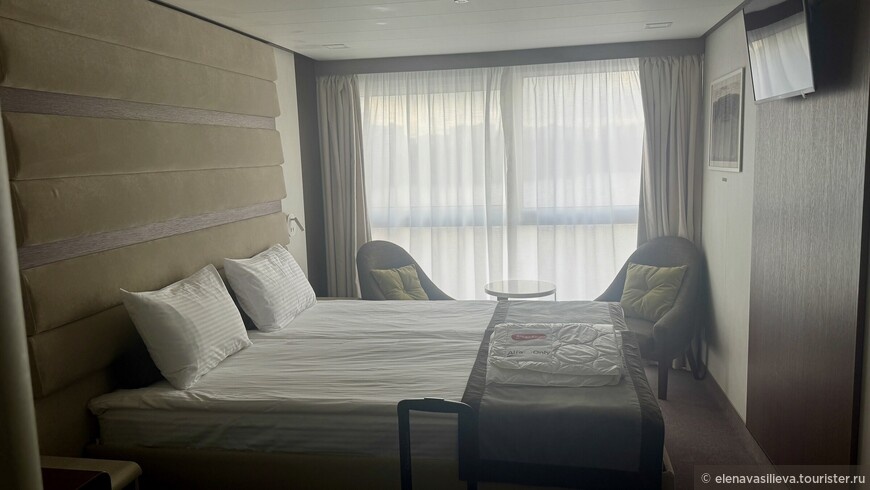 Итак, теплоход, принявший на борт 309 пассажиров (максимальная загрузка), отправился в путь. Получив бокал игристого при регистрации и ключи от каюты, я поднялась на лифте на четвёртый этаж. Лифтов здесь два, и работают они очень быстро — ни разу не пришлось ждать. Я выбрала стандартную каюту на шлюпочной палубе, прямо за рубкой. Это оказалось удачным решением: шум двигателей и вибрация там совершенно не ощущаются.