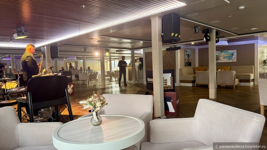 Здесь проводятся основные мероприятия: знакомство с капитаном, развлекательные шоу. Привыкшая к камерным барам обычных теплоходов, я чувствовала здесь некоторый дискомфорт — всё слишком масштабно и шумно. Хотя молодёжи такие условия явно по душе.