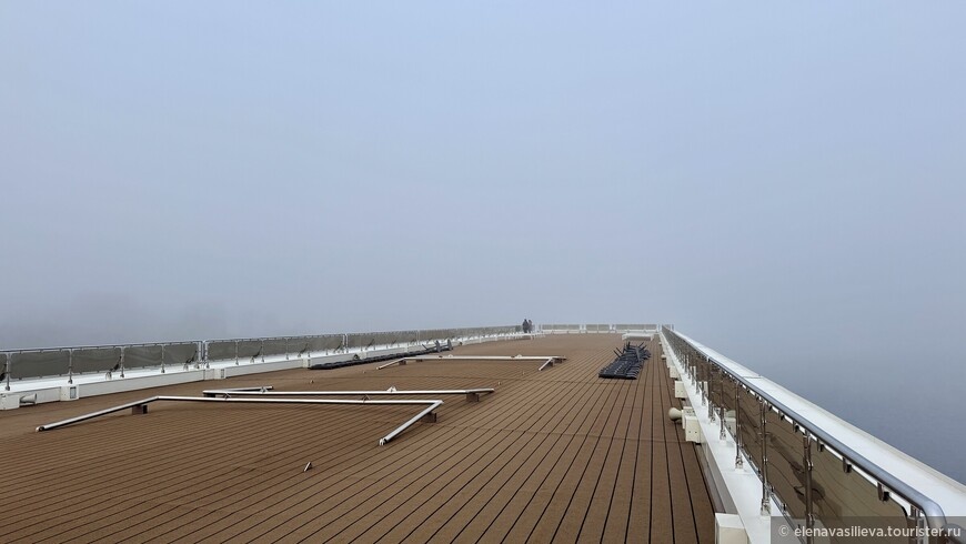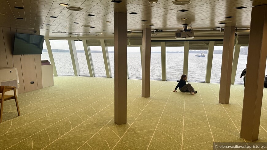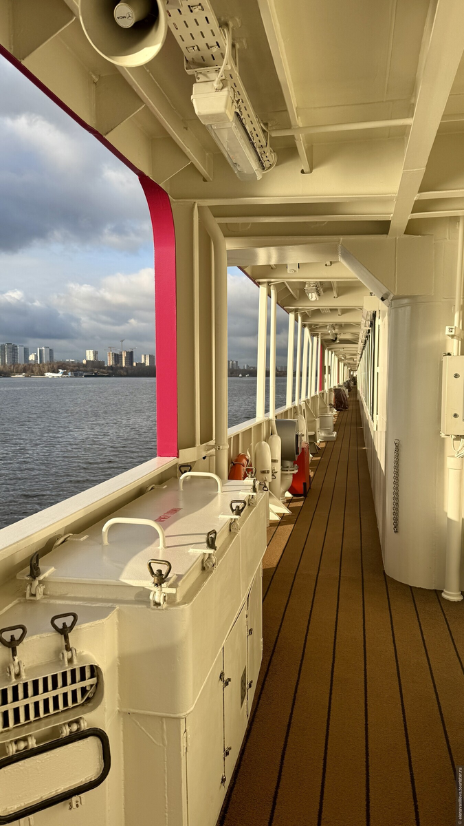 После обеда хочется прогуляться. «Мустай Карим» отличается от многих теплоходов отсутствием полноценных прогулочных зон. Это не совсем так: на выходах к трапам есть небольшие балконы с шезлонгами, но в холодное время года они не пользуются спросом. Также есть главная палуба, свободная от кают, где теоретически можно гулять.