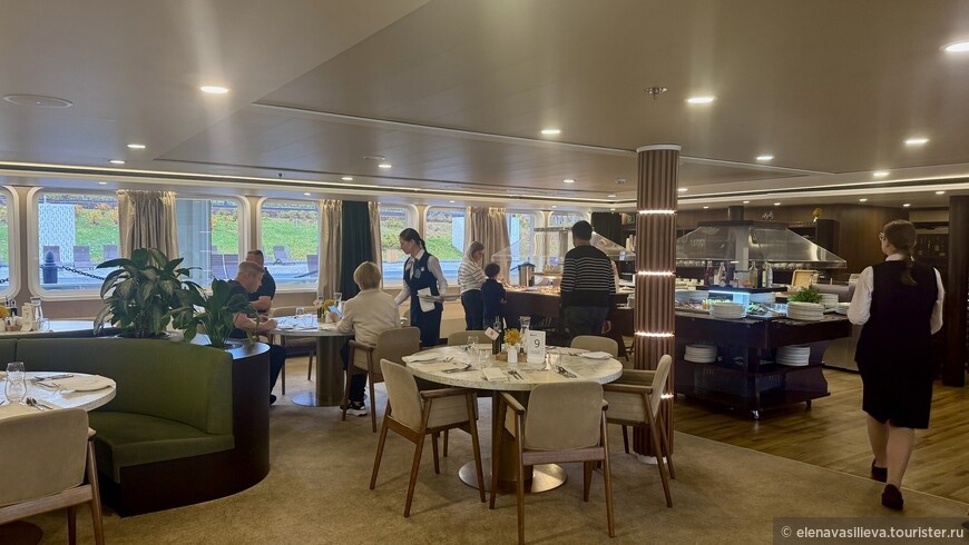 Первый визит в ресторан — один из самых волнительных моментов круиза. Дело не только в качестве еды, но и в знакомстве с соседями по столику. Команда «Мустая» учитывает пожелания: если вы хотите сидеть одни, вашу просьбу выполнят.