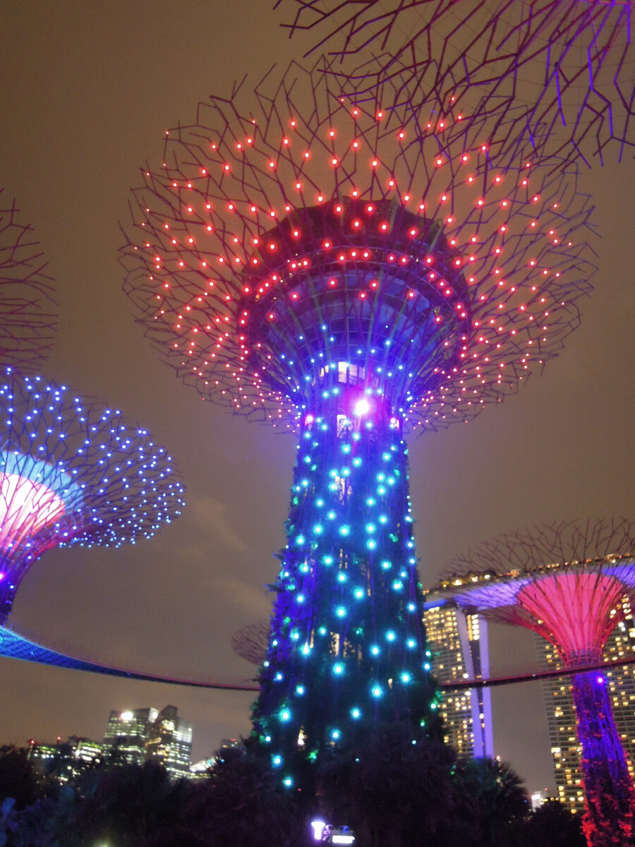 Наиболее узнаваемая конструкция — гигантские деревья высотой от 25 до 50 метров. Их стволы обвивают папоротники и лианы, а кроны — металлические конструкции. Эти сооружения из бетона и железа используют солнечную энергию для важных функций. Вечером сюда приходят ради светового шоу «Садовая рапсодия».