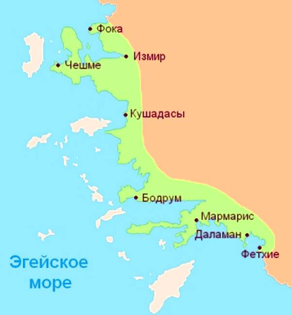 Вторым по посещаемости среди турецких морей является Эгейское. Оно расположено на западе страны, климат здесь мягкий и сухой, поэтому жара переносится легче, а пляжи отличаются исключительной чистотой. На побережье работает множество отелей и развлекательных заведений разного уровня. Отдыхающих ждут хвойные леса, живописные бухты, величественные скалы, глубокие гроты, античные руины и более двух тысяч островов.
