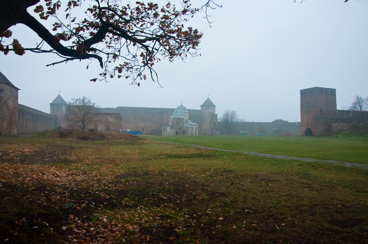 История этой твердыни началась в 1239 году с деревянного форпоста, заложенного князем Александром, будущим Невским. Каменные стены из тёмного местного известняка возвели в 1387 году. Вскоре границы отодвинулись, и крепость, утратив пограничное значение, законсервировалась в своём средневековом виде. Сейчас здесь идёт реставрация, начатая в 2024 году. По официальным данным, к концу 2025 года готовность объекта составляла лишь 20%, поэтому крепость скрыта лесами и будет в них как минимум до конца текущего года. Но даже в строительных конструкциях чувствуется её мощь и суровая красота.