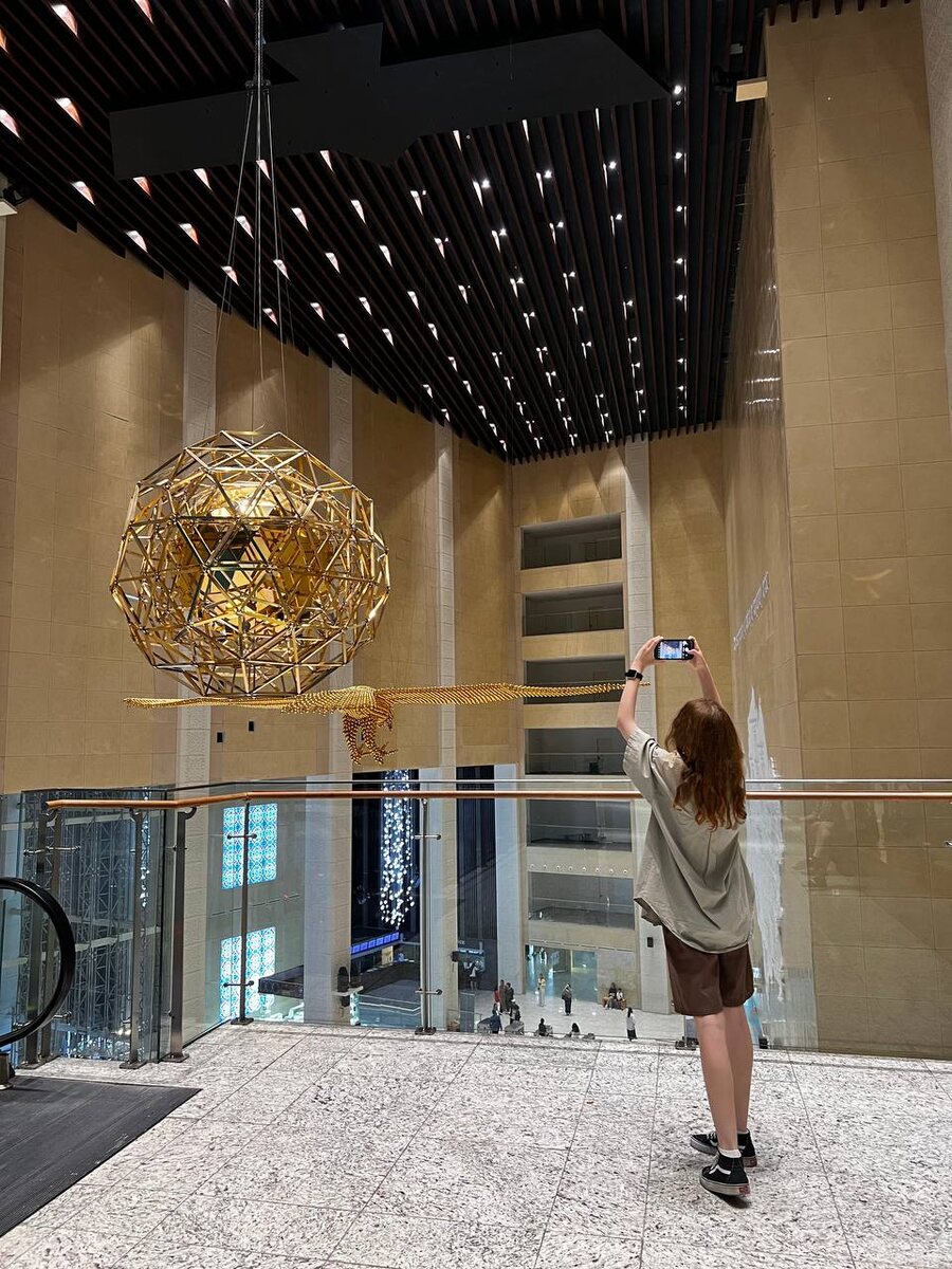В первый день мы решили посетить самый большой, по отзывам, музей. Здание впечатляет своей архитектурой, перед ним — красивый фонтан. Внутри несколько экспозиций на разных этажах. В холле нас встретила необычная золотая птица.