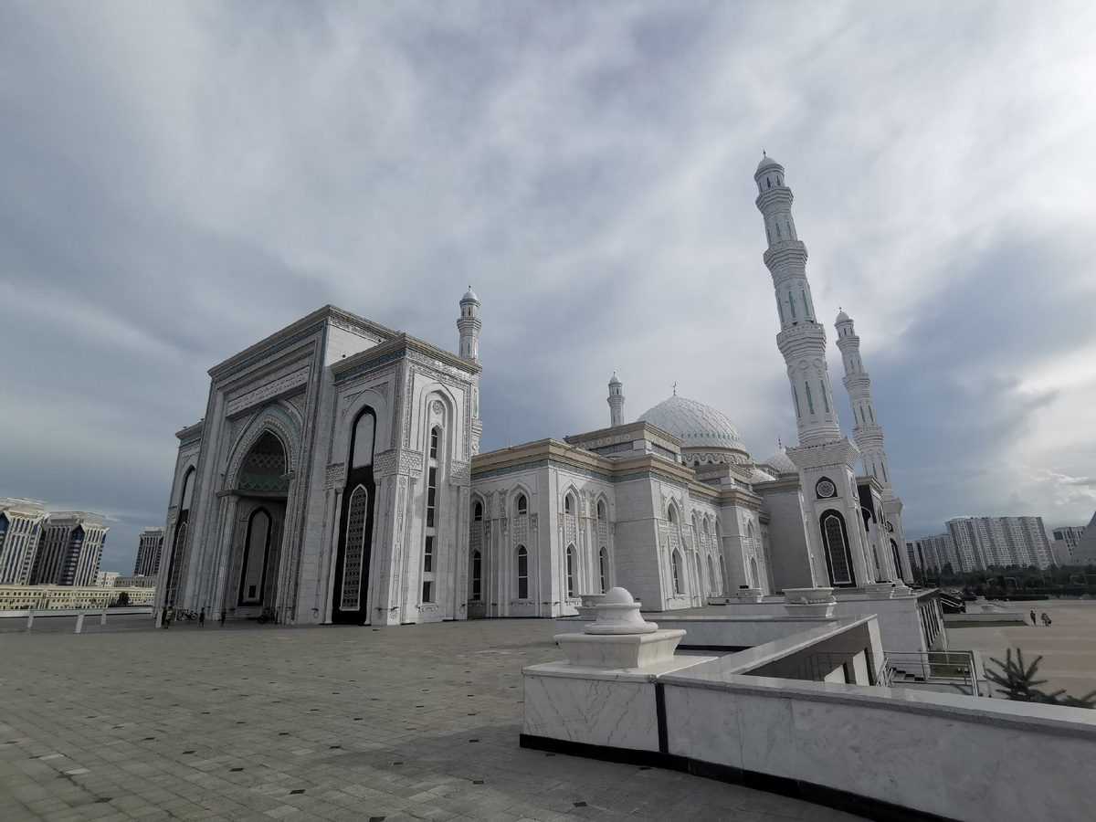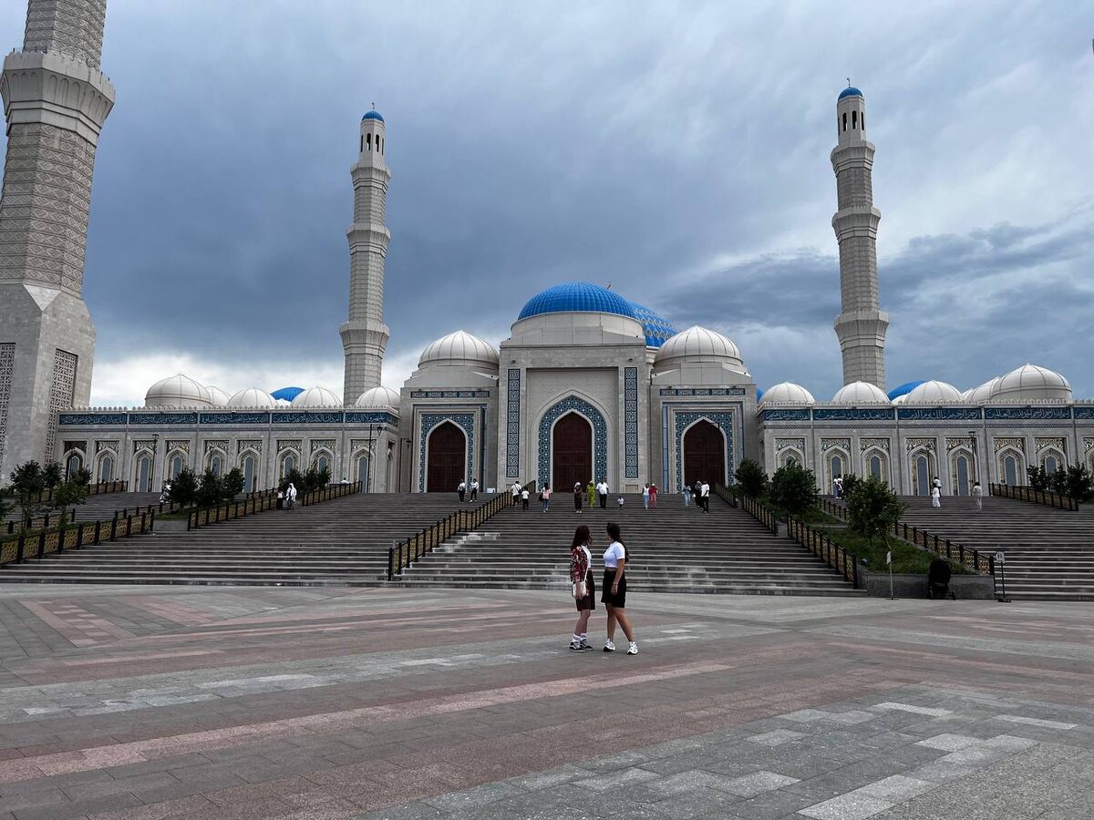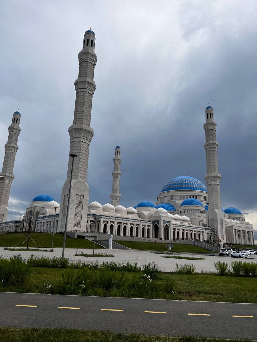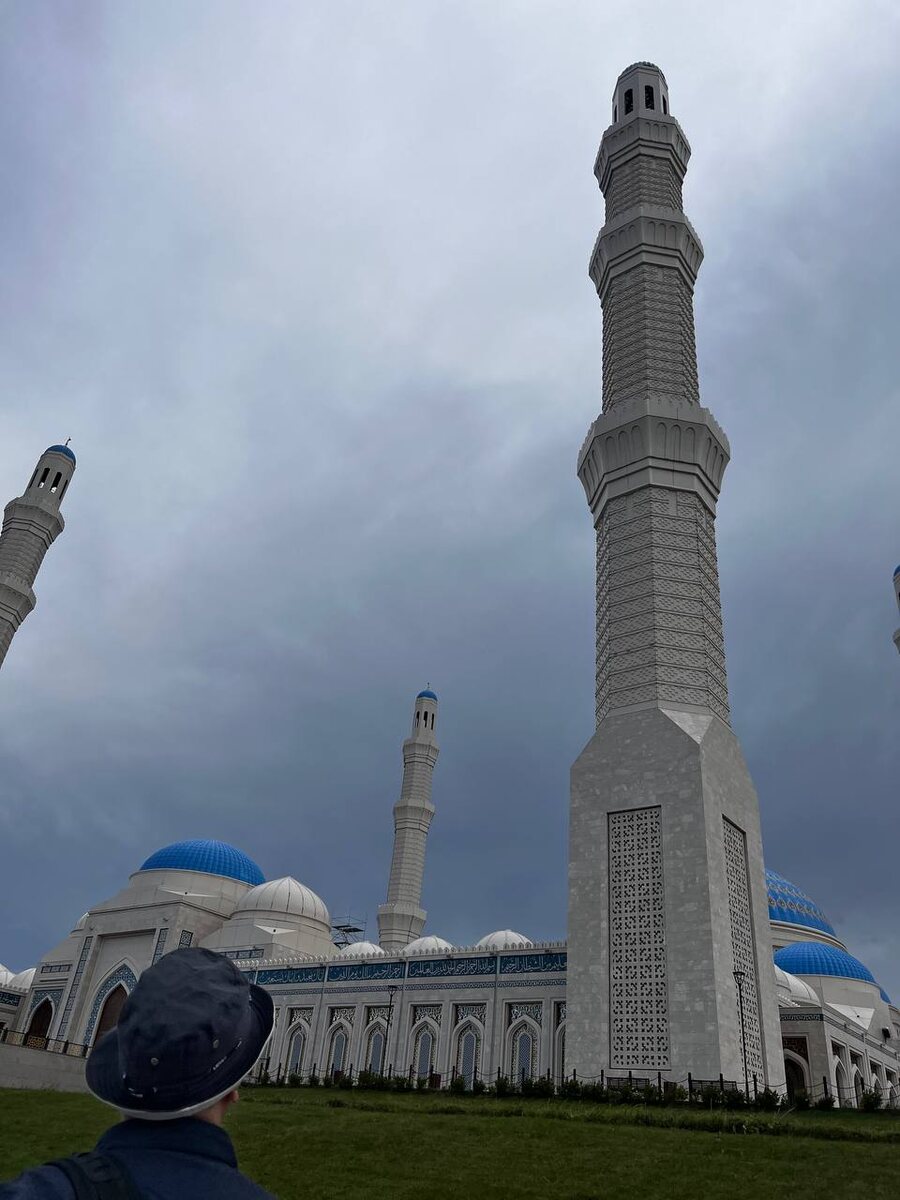 Дошли до центральной мечети — красивое здание с голубым куполом. Удивило наличие паркинга для машин и автобусов. Перед входом висел плакат с требованиями к одежде; если одет неподобающе, можно взять специальный халат. На входе дежурный показывал, где их взять. Мы побродили по залам, народу было много. Интересно было наблюдать за свадебной процессией, приехавшей для фотосессии. Затем посетили ещё одну мечеть — Хазрет Султан.