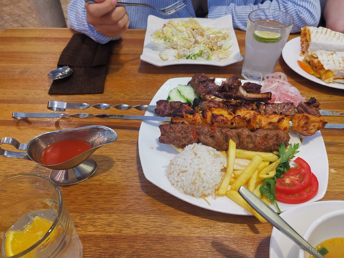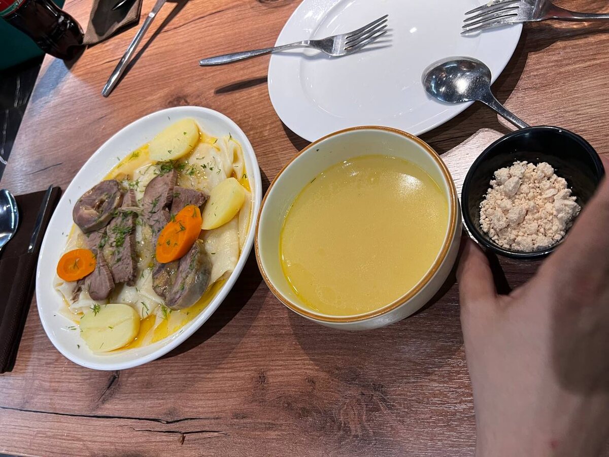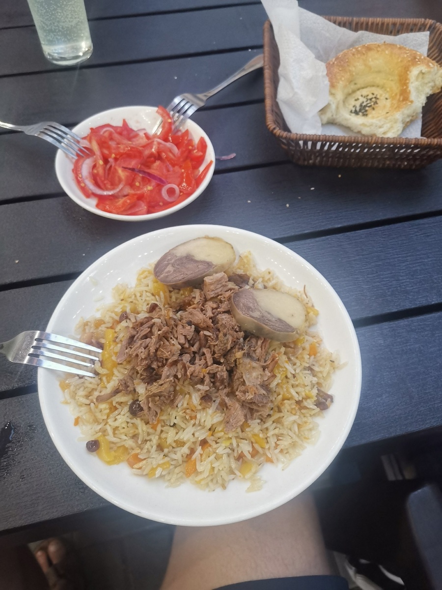 Посетив несколько кафе, мы удивились, что в меню нет алкоголя. Цены на продукты в магазинах почти не отличаются от российских — разницы мы не заметили. Завтракали стандартно: яичница с колбасой, мюсли с йогуртом. Закупались в сетевом супермаркете SMALL, похожем на наши «Магнит» или «Пятерочку». А вот цены в кафе и ресторанах приятно порадовали. Лишь один раз мы потратили на еду больше 5000 тенге на человека. В основном чек на четверых составлял около 18 000 тенге (без алкоголя, которого в меню, как правило, нет). Очень понравились шашлыки из баранины, бешбармак и плов. Привезли с собой рецепт салата из помидоров с луком. Кухня здесь преимущественно мясная — говядина и конина. Плов — отдельный вид искусства: даже в специализированных заведениях у нас его так не готовят. В галерее — меню из разных заведений, цены делите на пять.
